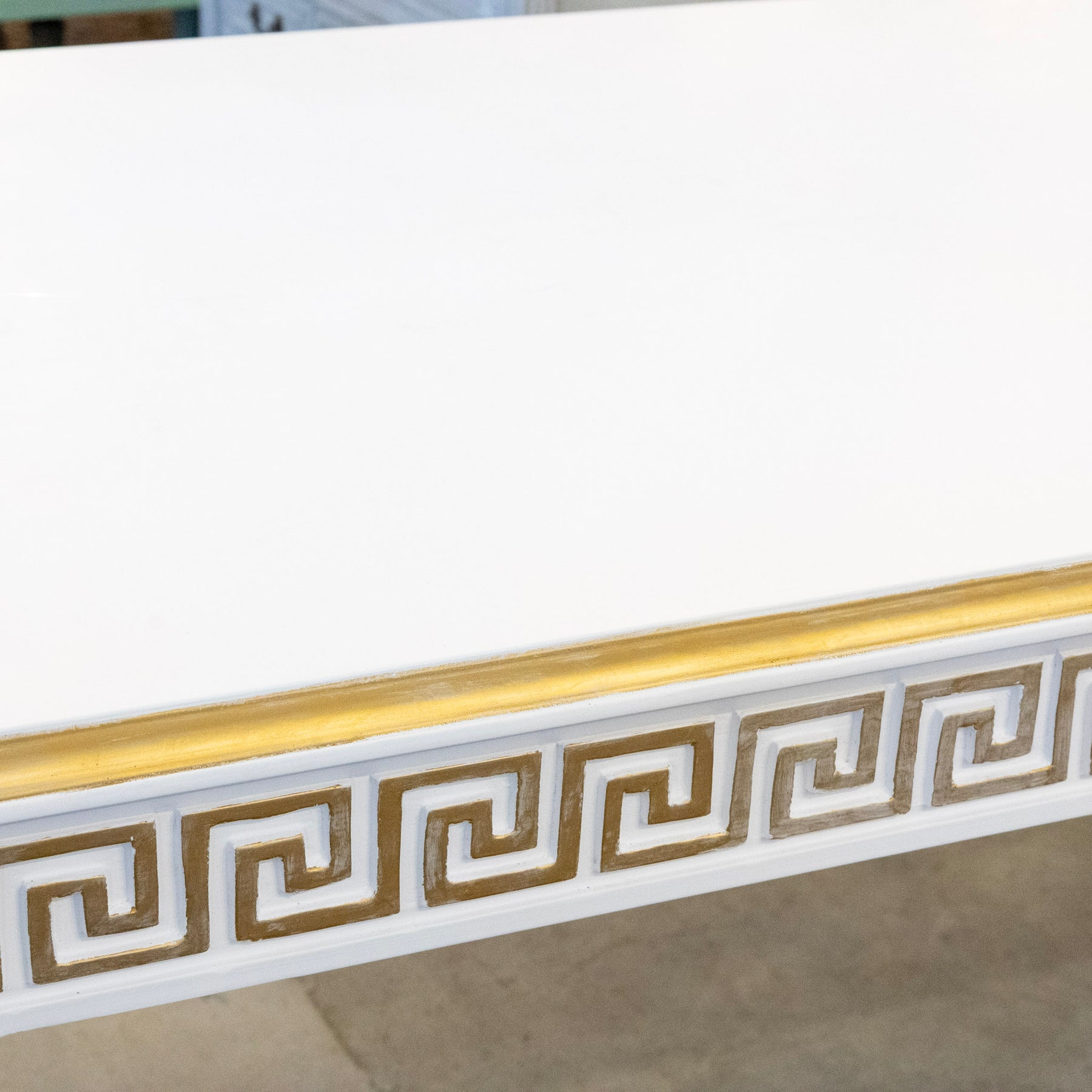 Description: Elegant Swedish neoclassical design, this table is defined by its sculpted silhouette and refined ornamentation. The crisp painted white finish is accented by a continuous gilded Greek key apron, creating a striking architectural border along the perimeter. Long, rounded legs taper gracefully to the floor, lending the piece a light, balanced presence despite its generous scale. Designed to anchor a dining room or statement kitchen, it offers ample surface space while maintaining elevated profile.