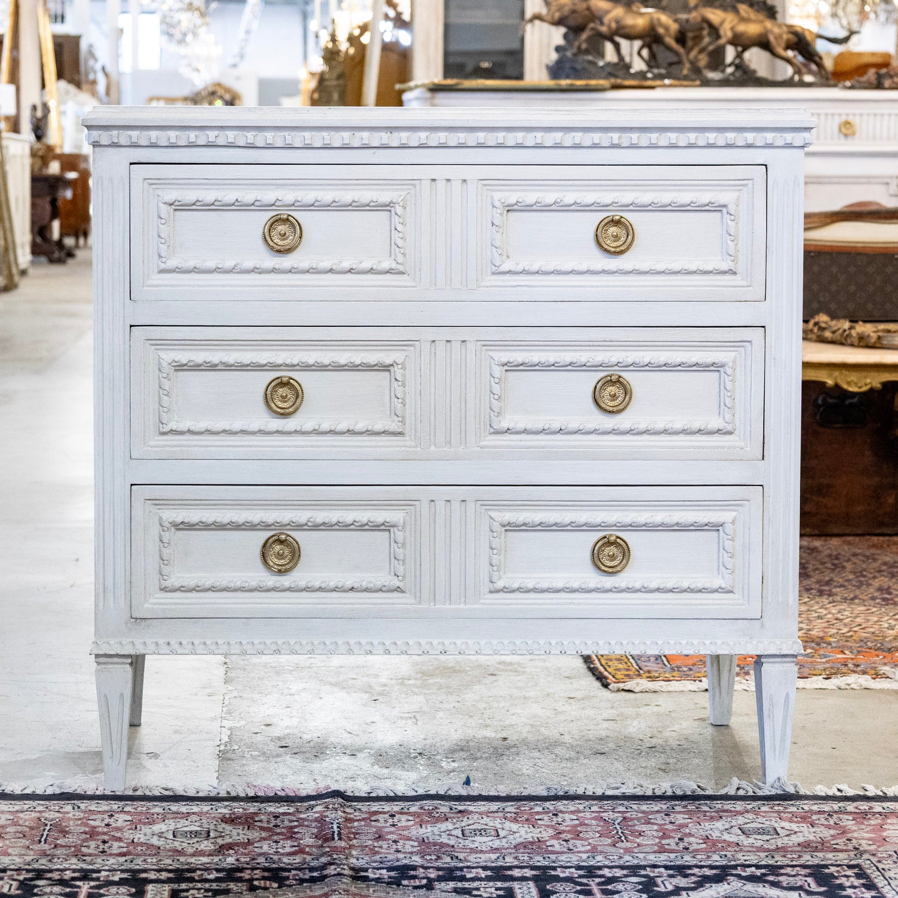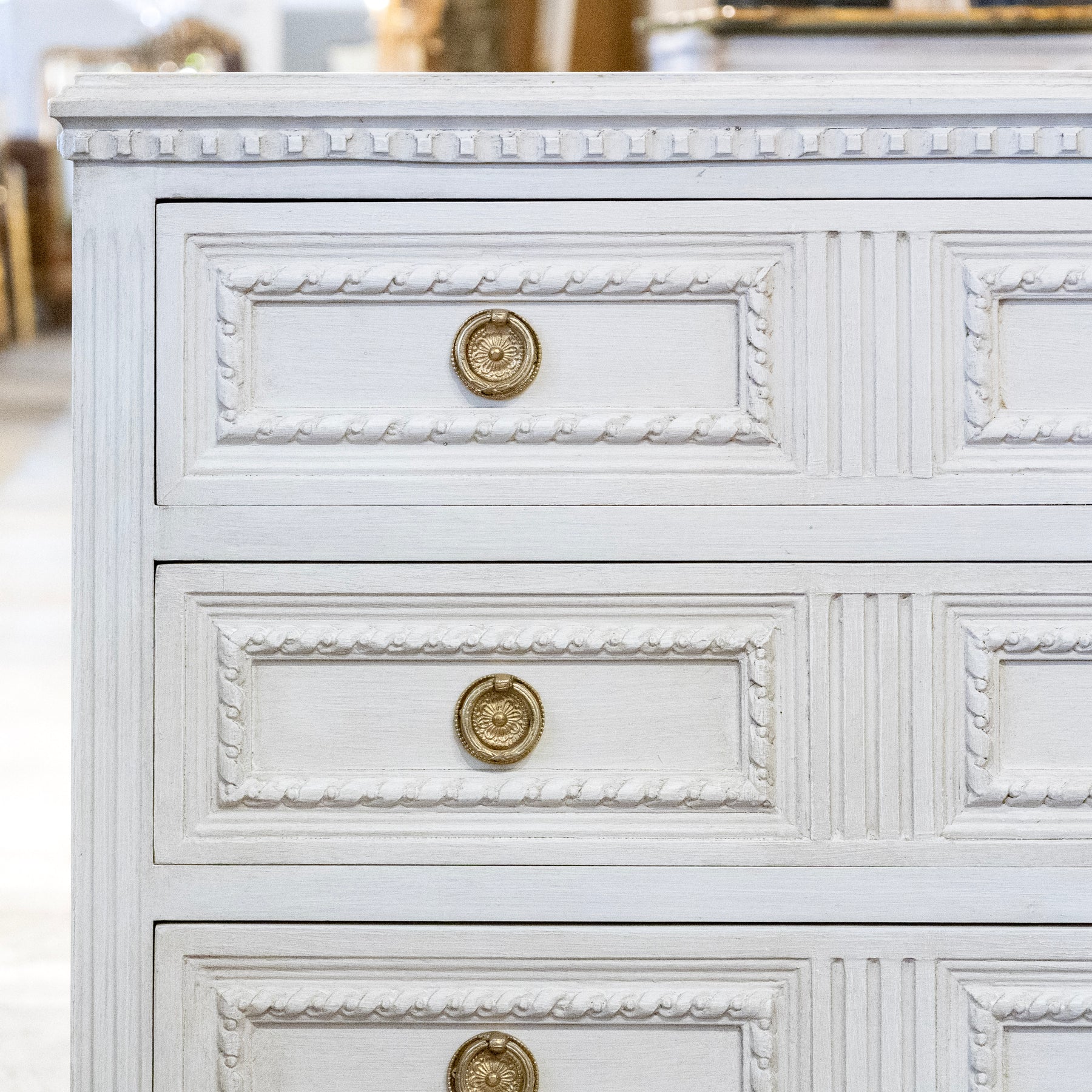 Description: This Swedish vintage chest features a broader, balanced silhouette defined by its crisp three-drawer configuration and finely articulated painted finish. Each drawer is framed with carved rope trim that adds depth and texture, while fluted vertical detailing at the center introduces subtle rhythm across the piece. A dentil-style apron and gently tapered legs complete the architectural composition, grounding the piece with classic Scandinavian restraint. Finished with round brass pulls, this chest offers generous storage and a refined presence well suited for bedrooms, entryways, or layered interiors.