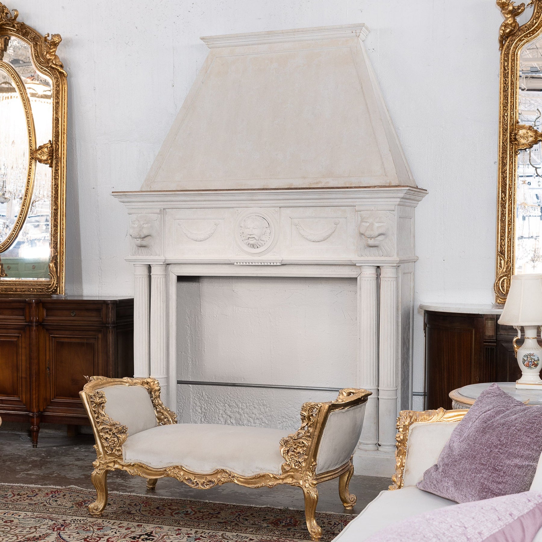 This elegantly crafted mantel exudes classical refinement, featuring a stately hood supported by robust columns. The white stone provides a luminous contrast that enhances its sculptural qualities. Decorative medallions and lion head motifs add a touch of grandeur, reflecting the majestic artistry typical of neoclassical design. This piece is not just a fireplace surround but a statement of timeless taste, sure to anchor a room with its commanding presence and historical significance.